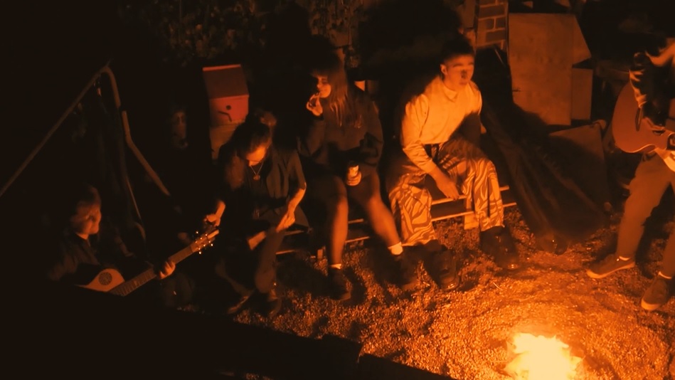 Footage comprises the four rambling contentedly and walking their dog through Yorkshire countryside, taking in the astonishing, rolling scenery, the group putting the song together in their rehearsal studio and then some late night relaxation around a campfire, with a charming shot at the point the song reaches its apex – drone footage takes us over above the scene, where we find out what felt like a huddle of mates chilling by a bonfire on a campsite near a far-flung beach is really taking place outside of their city centre rehearsal rooms; a sweet, exuberant, warm-hearted oasis in the centre of urban sprawl.