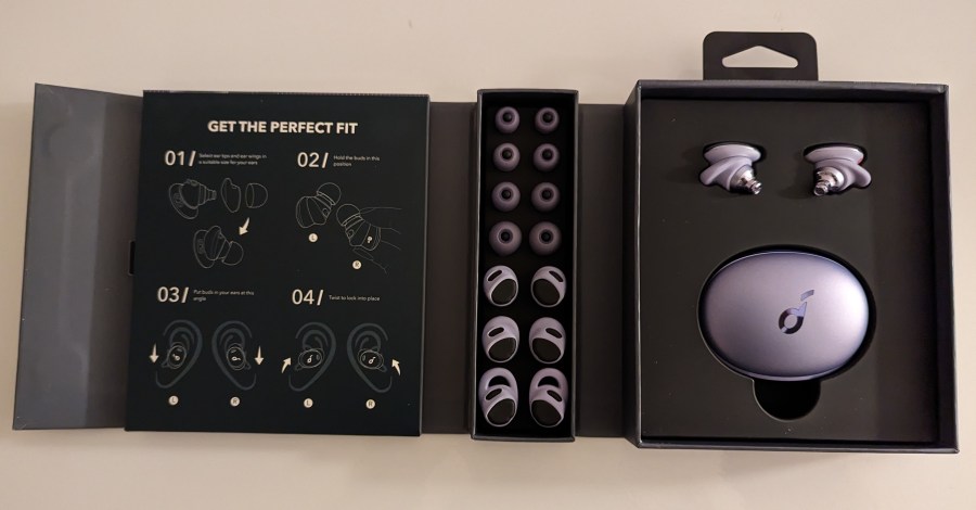 Also included in the expertly presented box are four choices of ear tips and four choices of ear wings, designed to give maximum comfort and minimum sound leakage, a USB to USB-C power cable and a quick and clear visual guide to finding the perfect earbud fit.