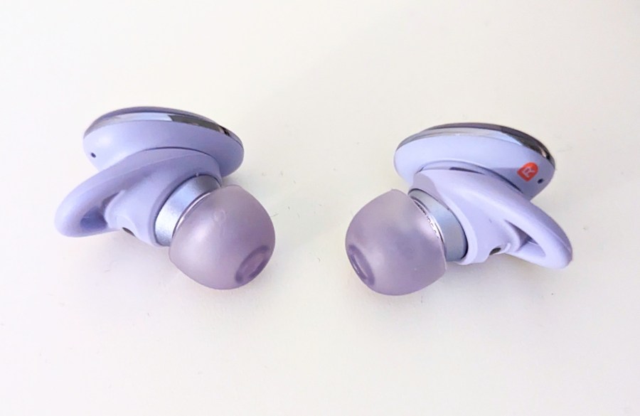 The Liberty 3 Pro earbuds look iconic. First off, the pebble case design is striking and it fits neatly in the palm of your hand. There are four choices of colour – white, black, blue-grey and light purple. We chose light purple, potentially brash but the light tone keeps it understated. The top of the pebble case slides satisfyingly back to reveal the smooth, deftly designed earbuds inside. When positioned on the contact points correctly, LEDs beneath the earpieces slowly pulsate to indicate they’re charging, along with three glowing LEDs on the front of the case, showing the power remaining.